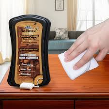 This product appears to be a multifunctional beeswax-based furniture polishing sponge designed to clean, shine, and protect wood surfaces. Key features highlighted on the packaging include: