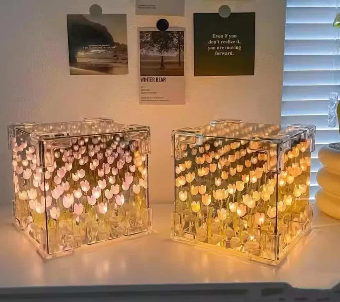 Artificial Tulips in Crystal Box – Handmade DIY Pink Tulip Cube Mirror Lamp, LED Night Light for Bedroom, Unique Flower Table Lamp – (Square)